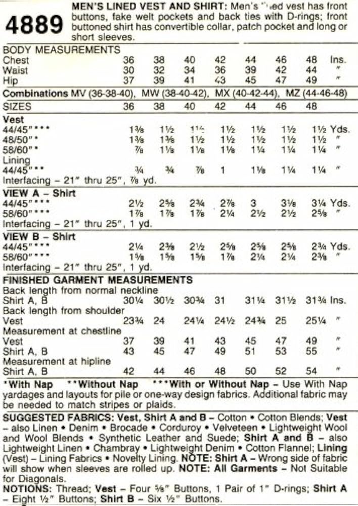 Mccall S 4889 Sewing Pattern Mens Vest Button Down Shirt Chest 38 40 42